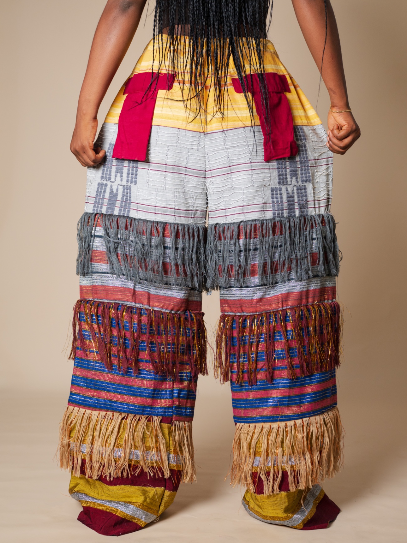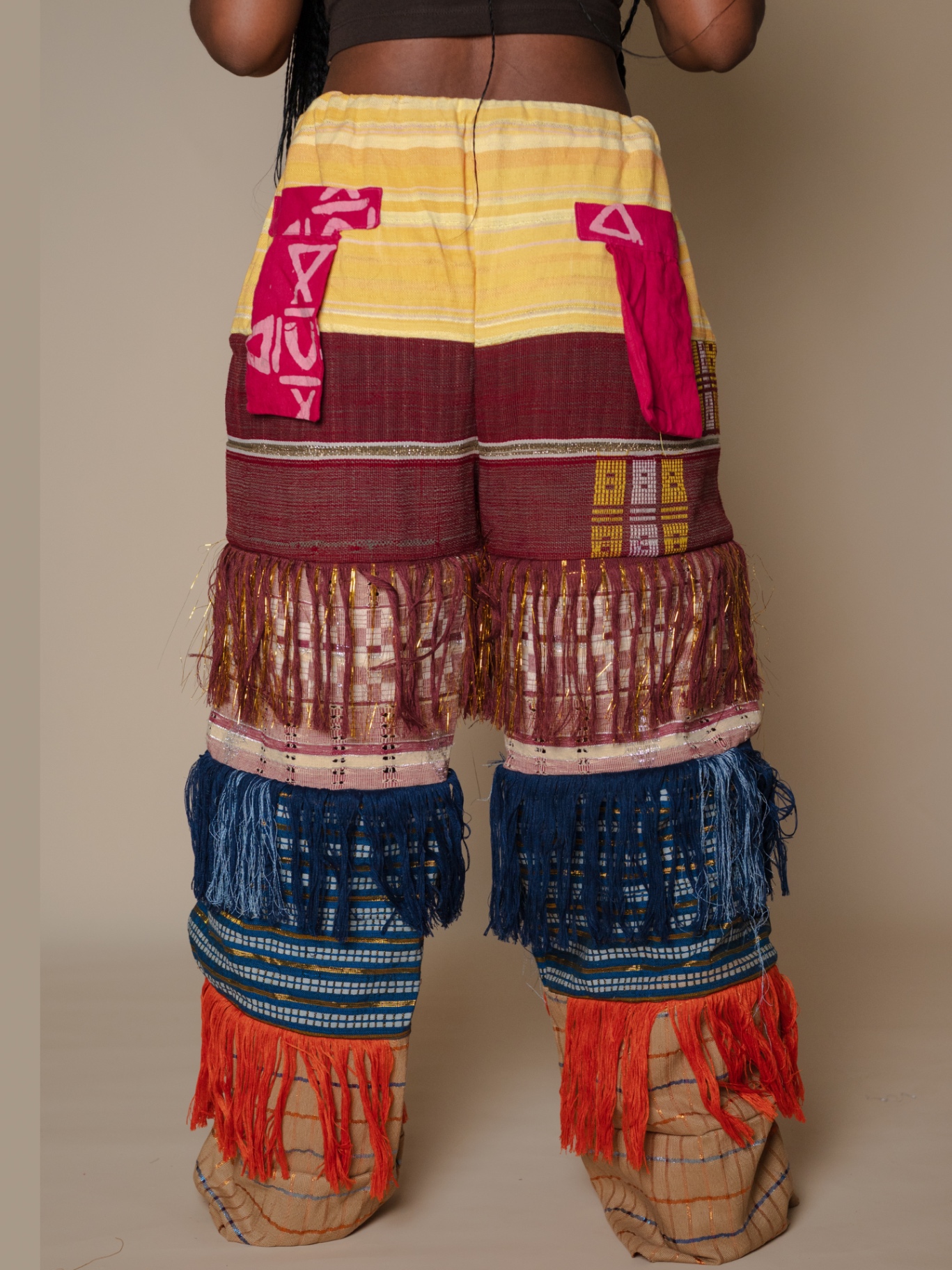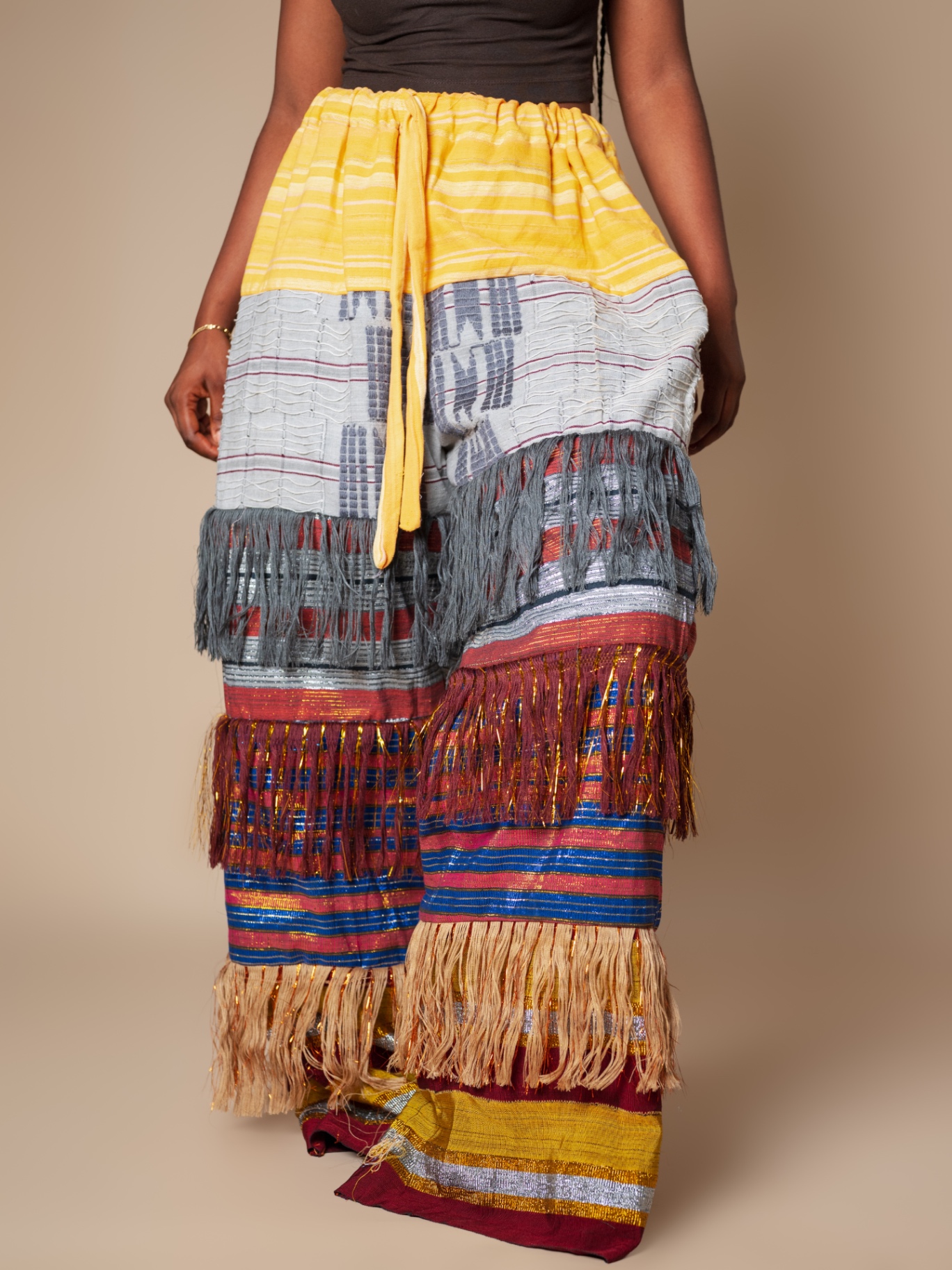Elevate your style with our Antique-Inspired Frills Pant, featuring vibrant Asooke patterns in luxurious cotton-silk fabric. The wide-leg cut and layered frills create a modern flair, while an elastic waistband ensures comfort. Perfect for making a statement, these pants blend traditional elegance with contemporary design. .Note : For a very baggy fit kindly go a size up . Model is wearing a small in the picture above Her waist :27/28 Hip:42 Height :5’5 Length :44 Kindly send us an email for a petite length option.