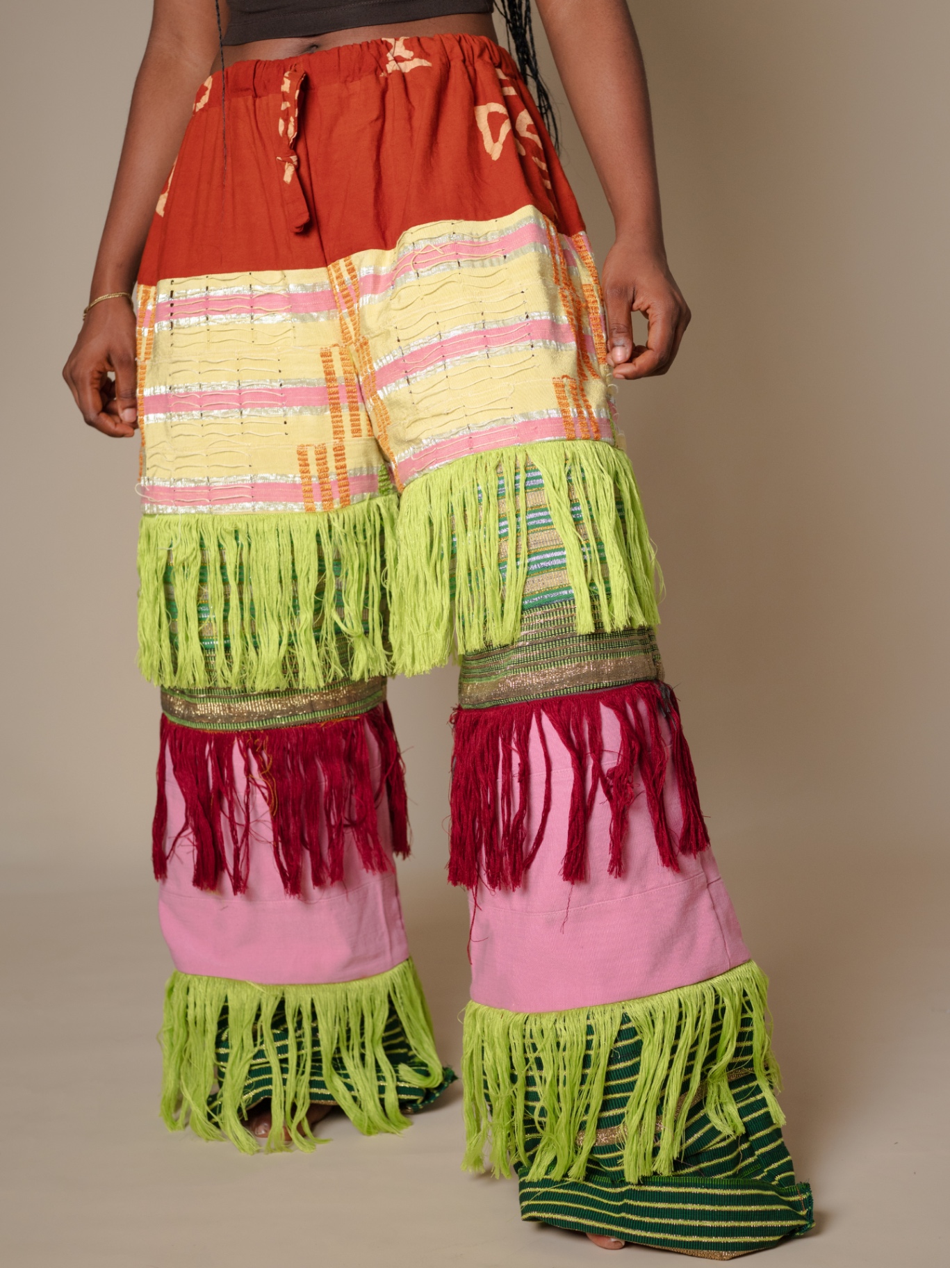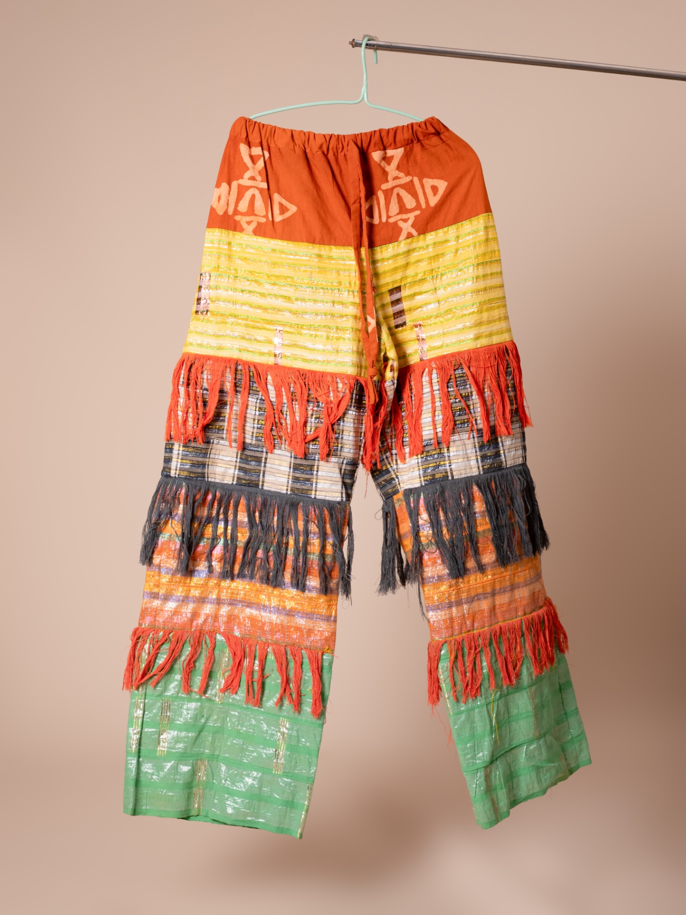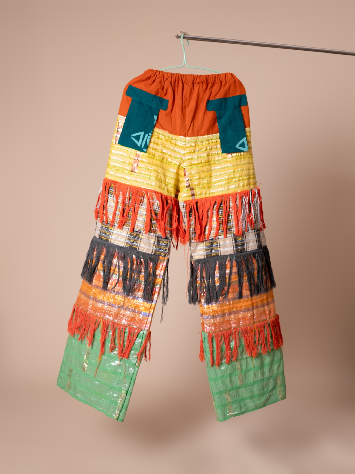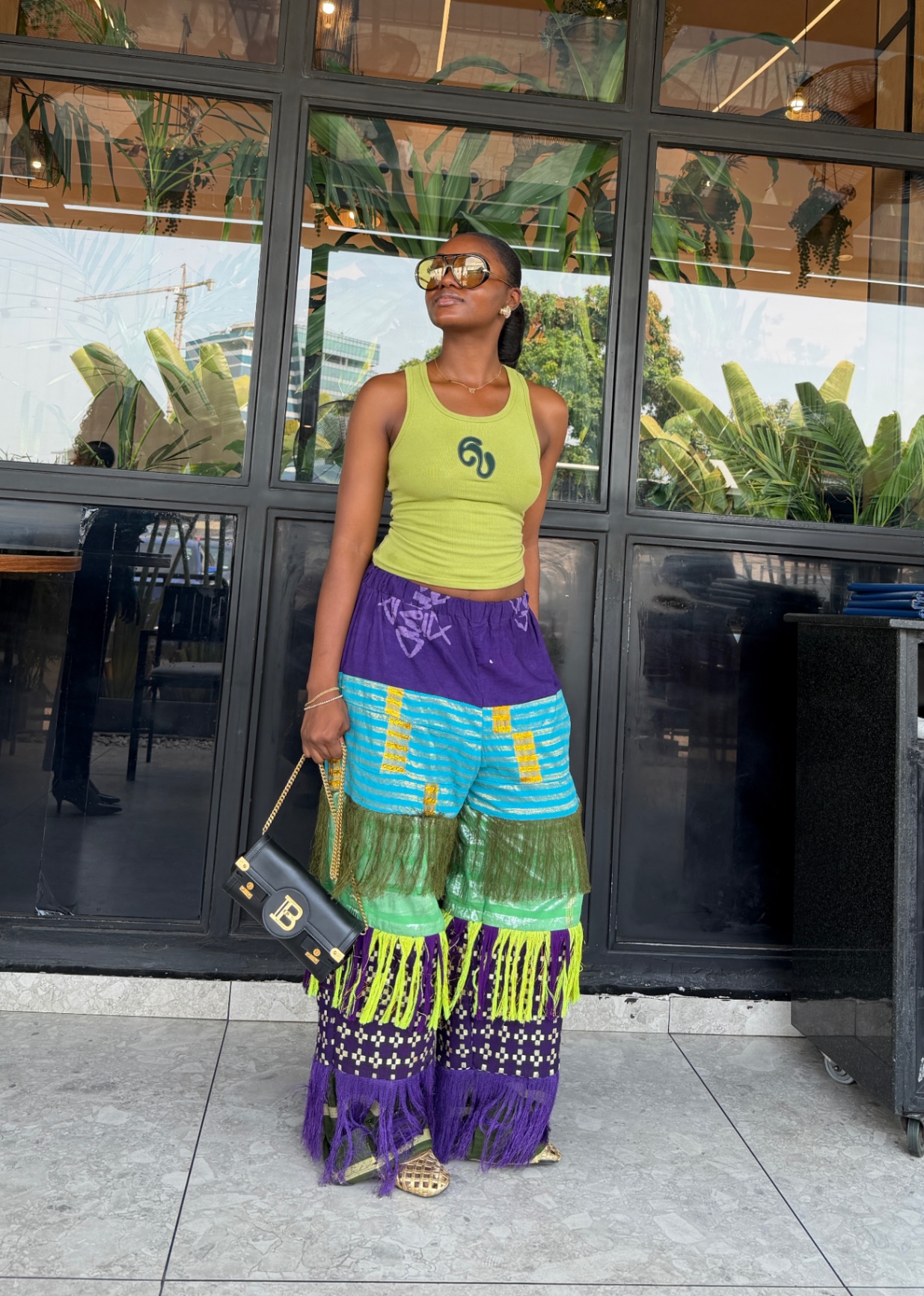 Elevate your style with our Antique-Inspired Frills Pant, featuring vibrant Asooke patterns in luxurious cotton-silk fabric. The wide-leg cut and layered frills create a modern flair, while an elastic waistband ensures comfort. Perfect for making a statement, these pants blend traditional elegance with contemporary design. .Note : For a very baggy fit kindly go a size up . Model is wearing a small in the picture above Her waist :27/28 Hip:42 Height :5’5 Length :44 Kindly send us an email for a petite length option.