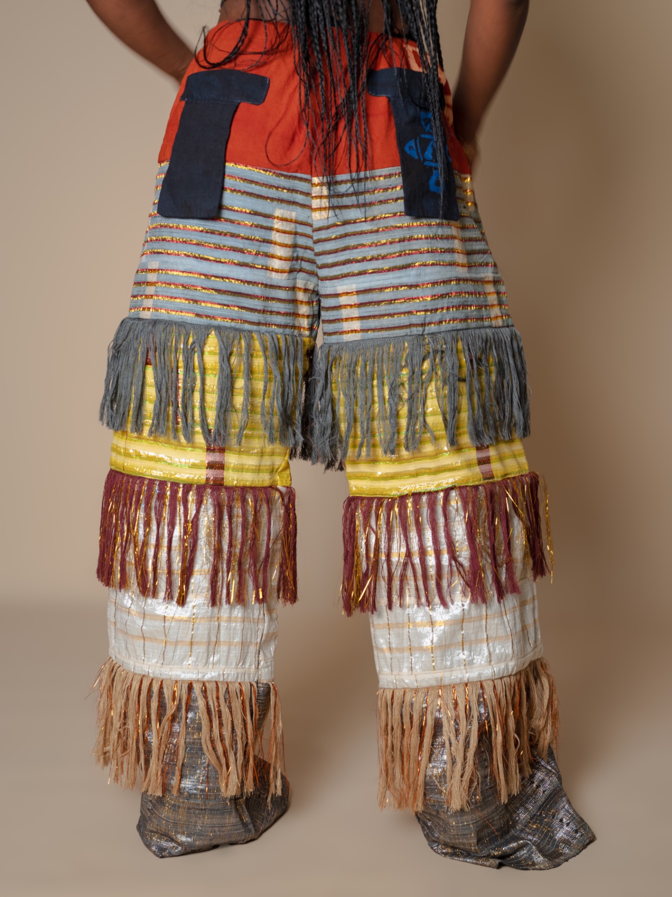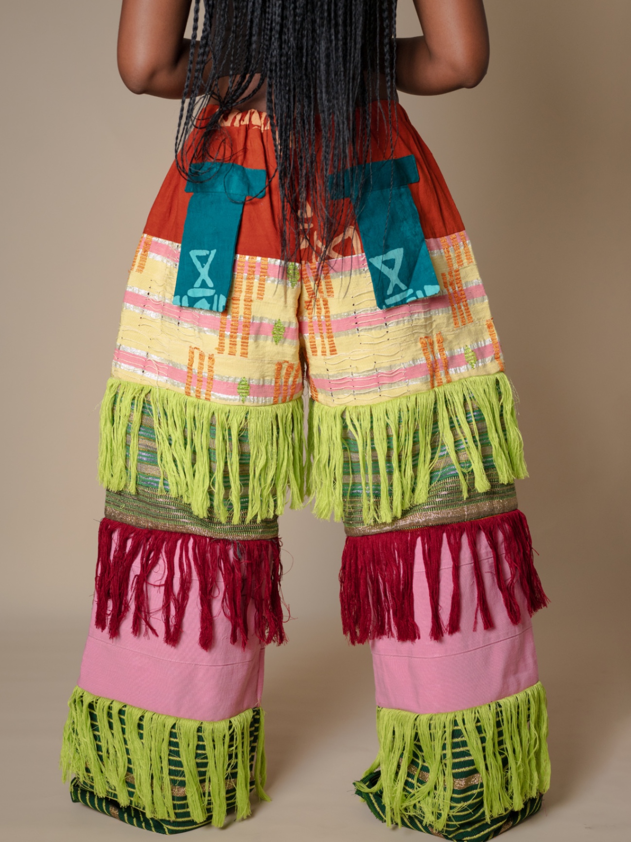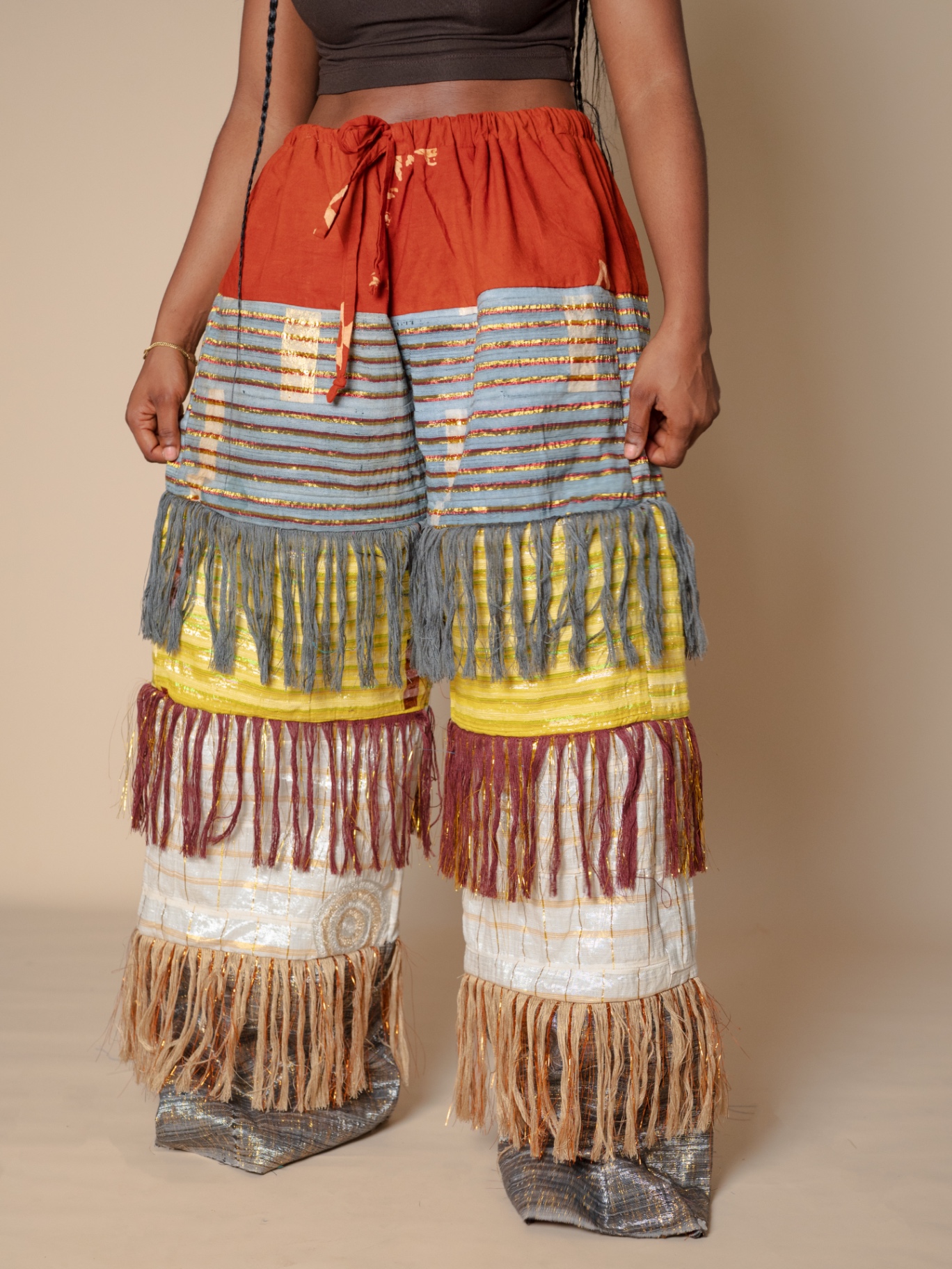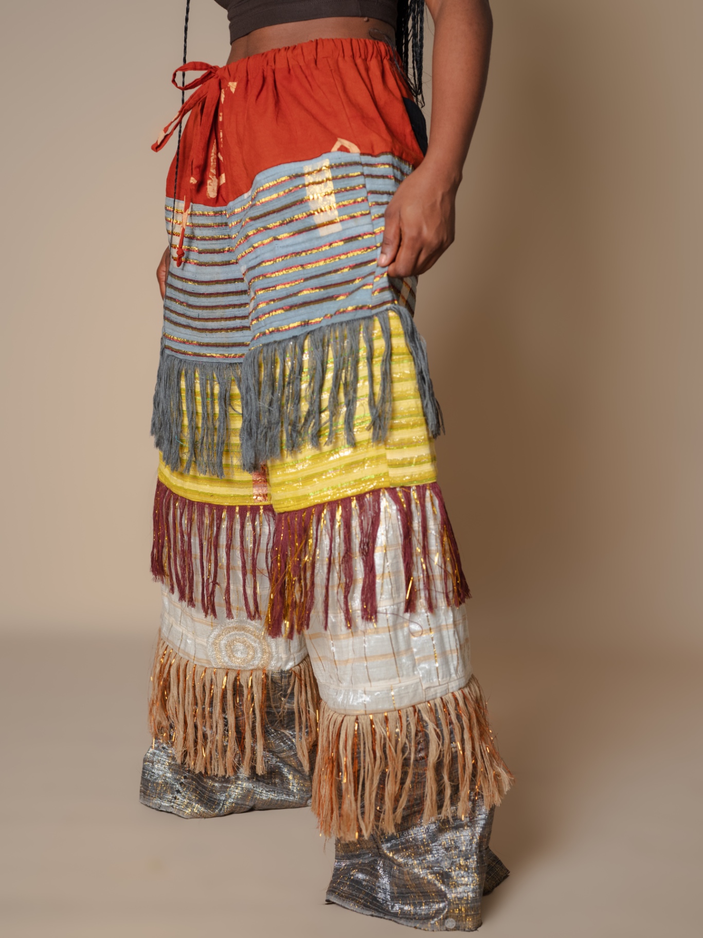 Elevate your style with our Antique-Inspired Frills Pant, featuring vibrant Asooke patterns in luxurious cotton-silk fabric. The wide-leg cut and layered frills create a modern flair, while an elastic waistband ensures comfort. Perfect for making a statement, these pants blend traditional elegance with contemporary design. .Note : For a very baggy fit kindly go a size up . Model is wearing a small in the picture above Her waist :27/28 Hip:42 Height :5’5 Length :44 Kindly send us an email for a petite length option.