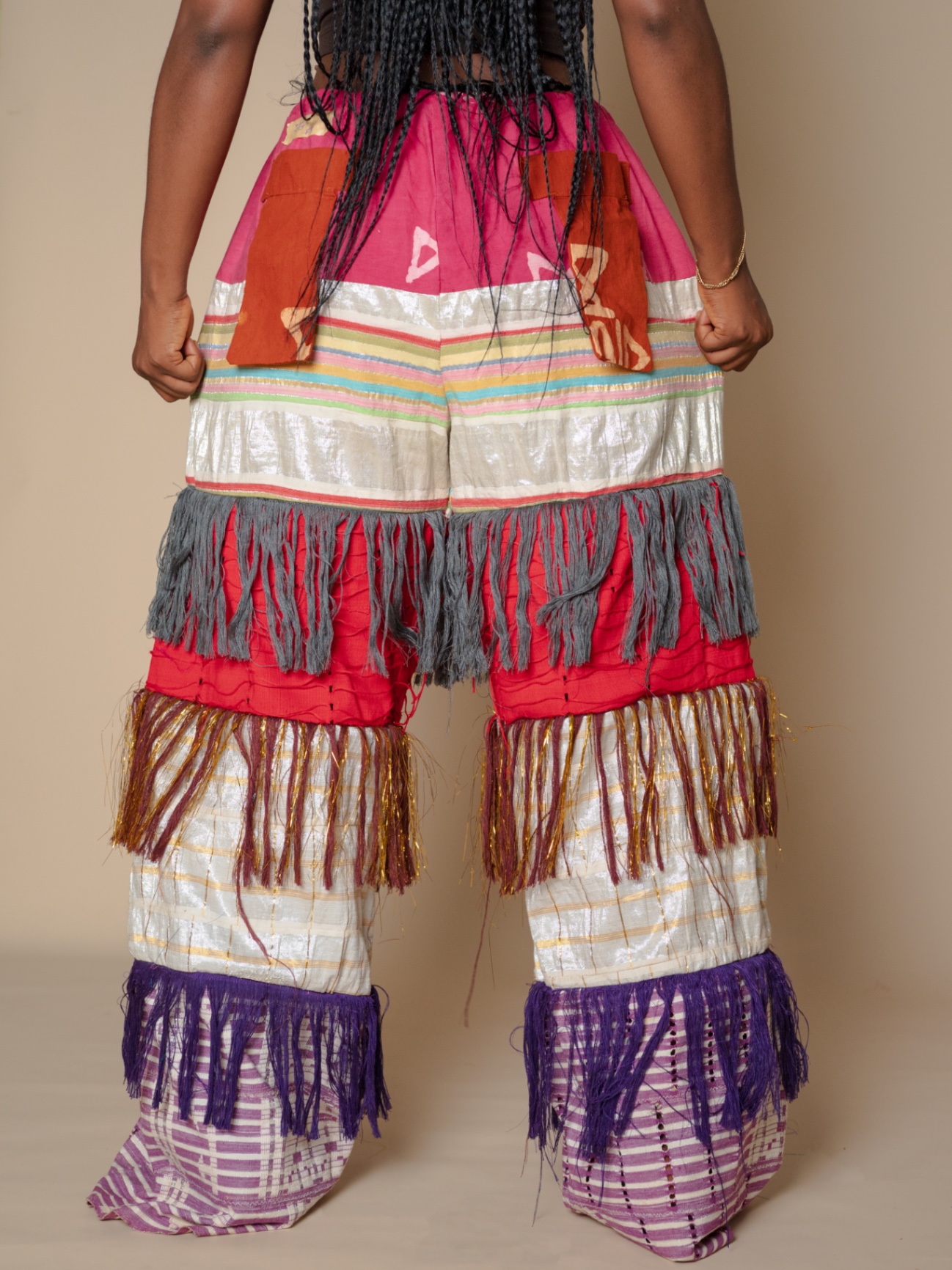 Elevate your style with our Antique-Inspired Frills Pant, featuring vibrant Asooke patterns in luxurious cotton-silk fabric. The wide-leg cut and layered frills create a modern flair, while an elastic waistband ensures comfort. Perfect for making a statement, these pants blend traditional elegance with contemporary design. .Note : For a very baggy fit kindly go a size up . Model is wearing a small in the picture above Her waist :27/28 Hip:42 Height :5’5 Length :44 Kindly send us an email for a petite length option.