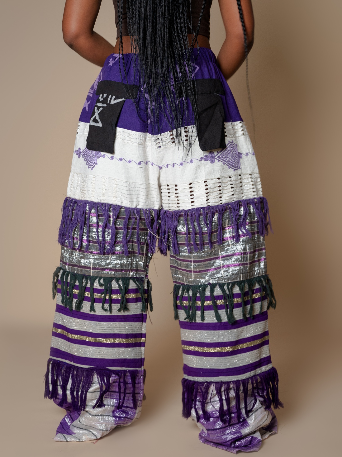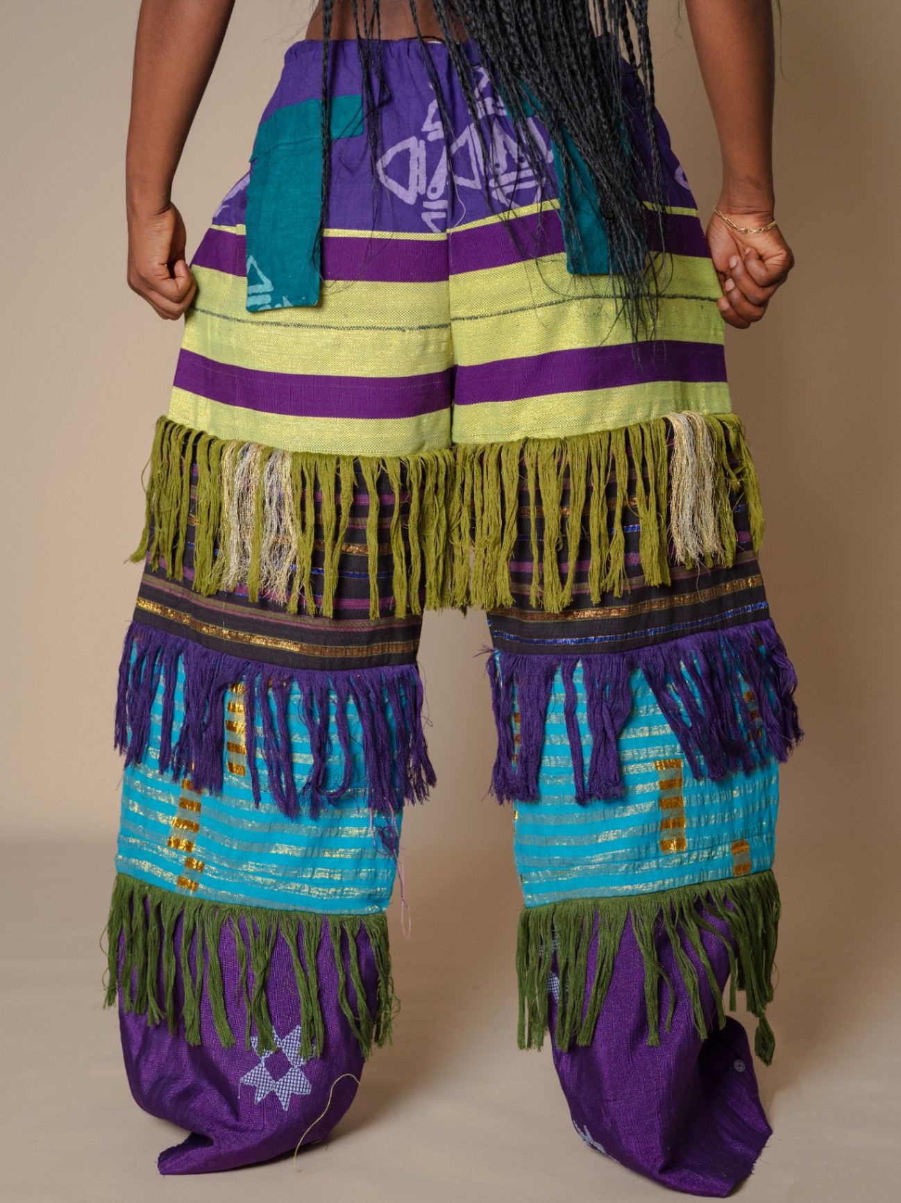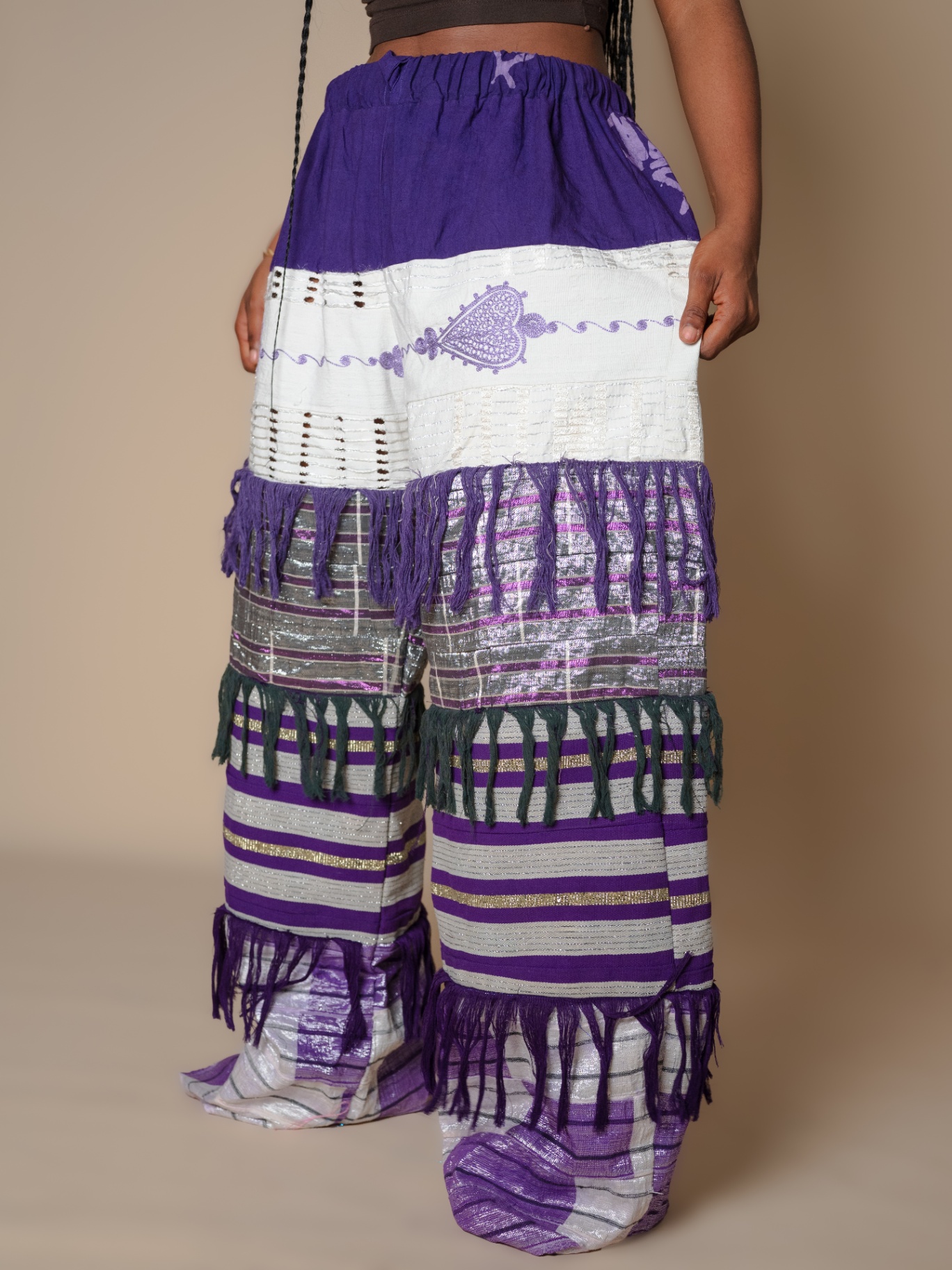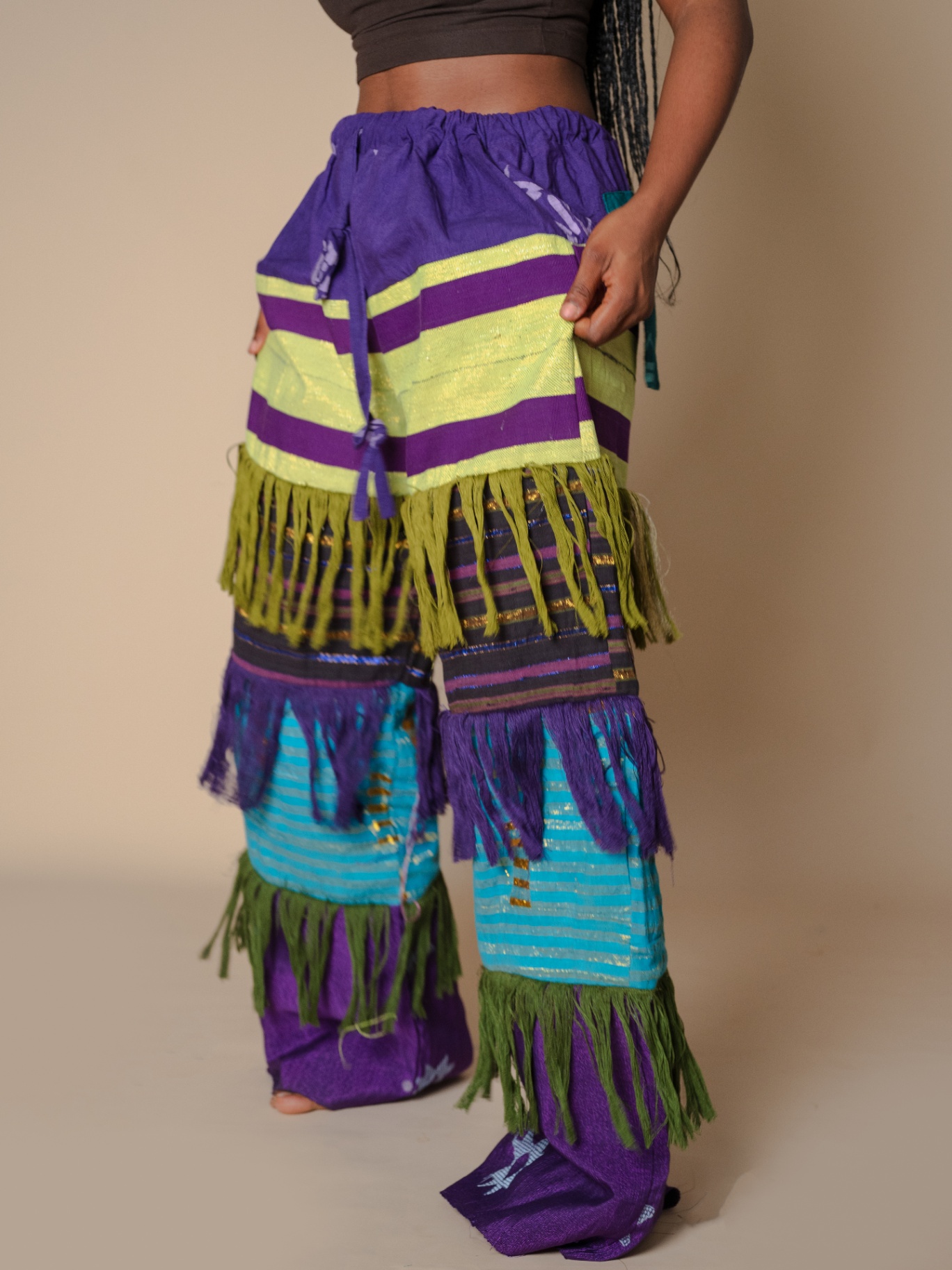 Elevate your style with our Antique-Inspired Frills Pant, featuring vibrant Asooke patterns in luxurious cotton-silk fabric. The wide-leg cut and layered frills create a modern flair, while an elastic waistband ensures comfort. Perfect for making a statement, these pants blend traditional elegance with contemporary design. .Note : For a very baggy fit kindly go a size up . Model is wearing a small in the picture above Her waist :27/28 Hip:42 Height :5’5 Length :44 Kindly send us an email for a petite length option.